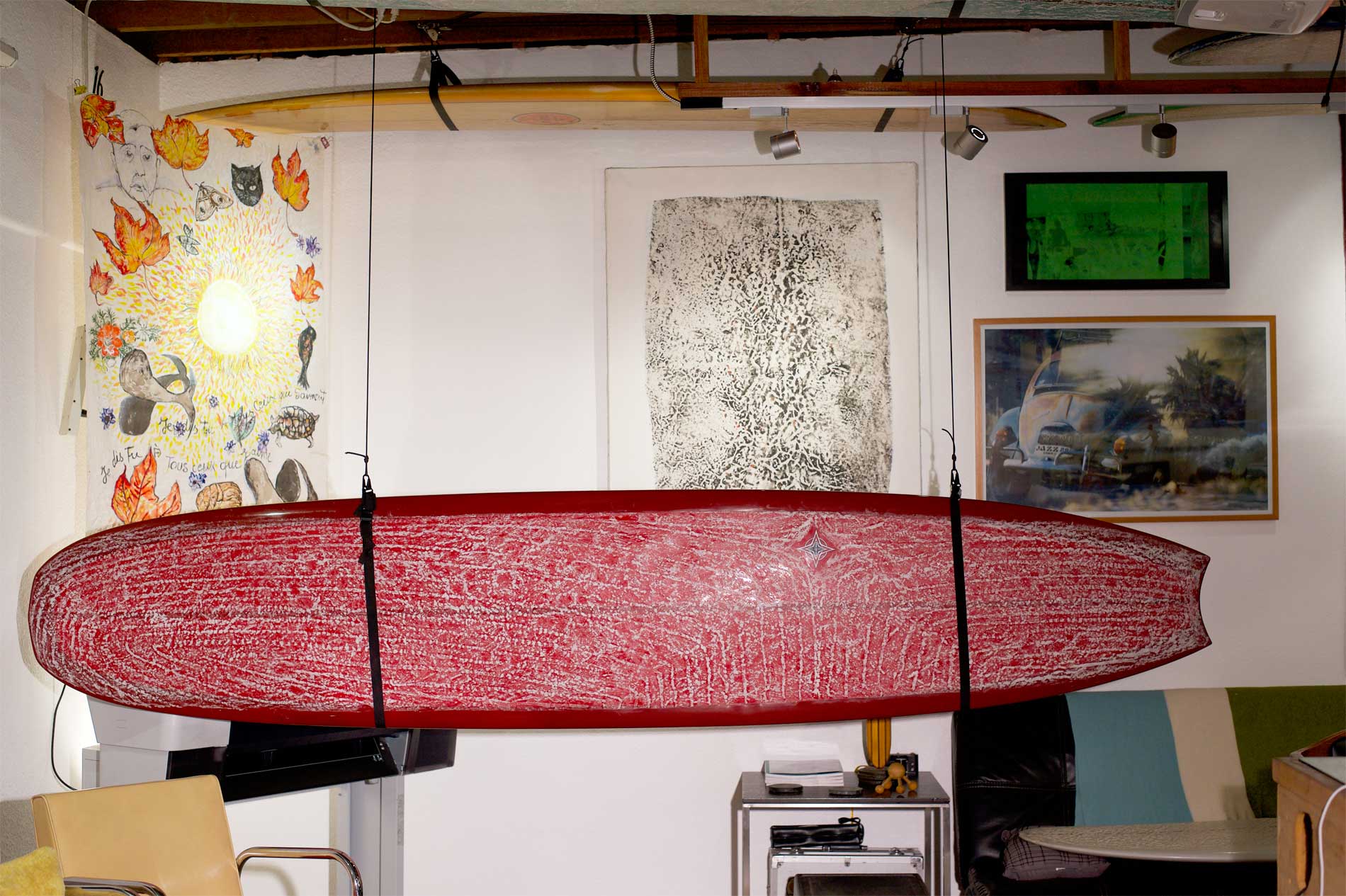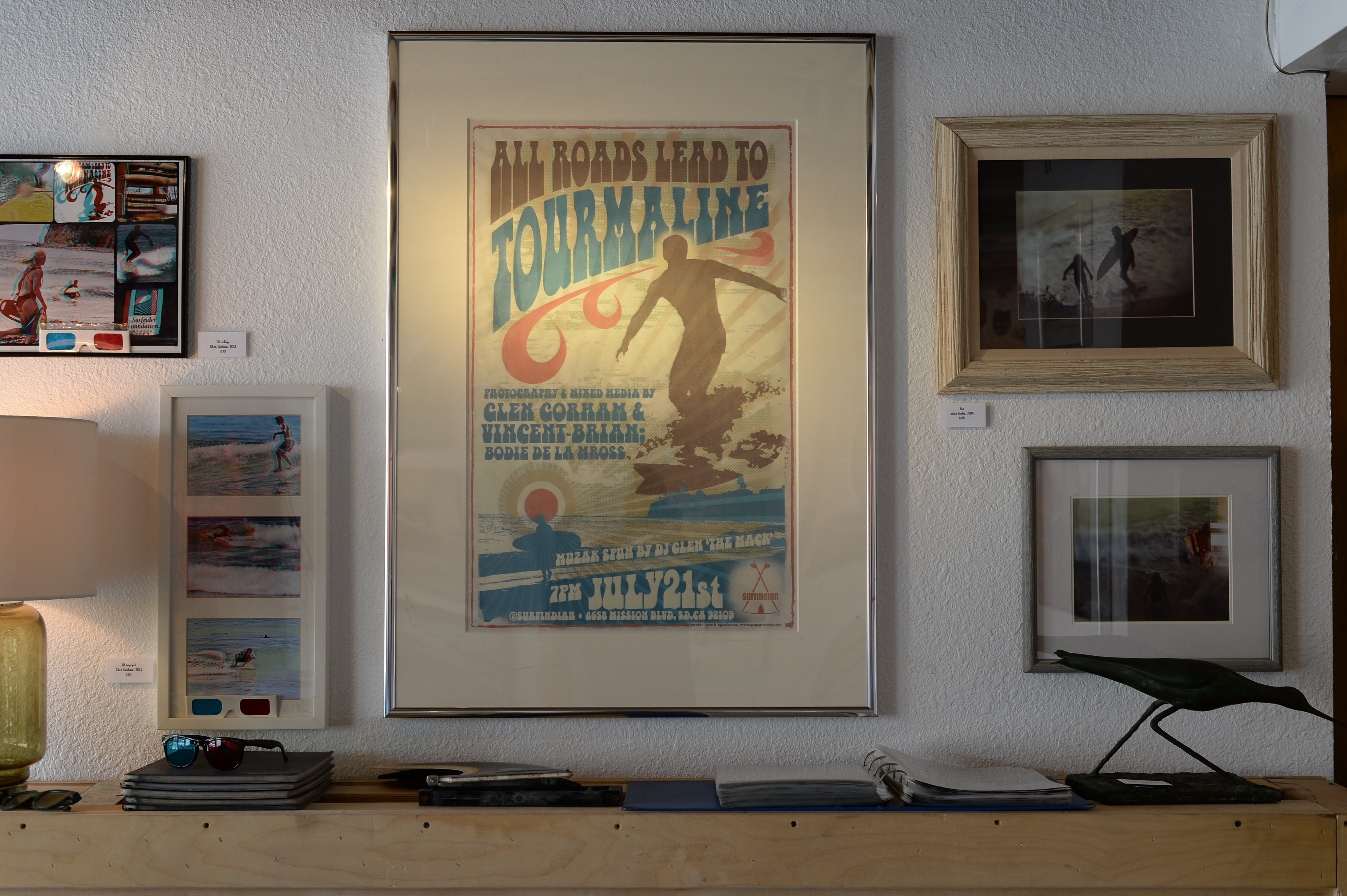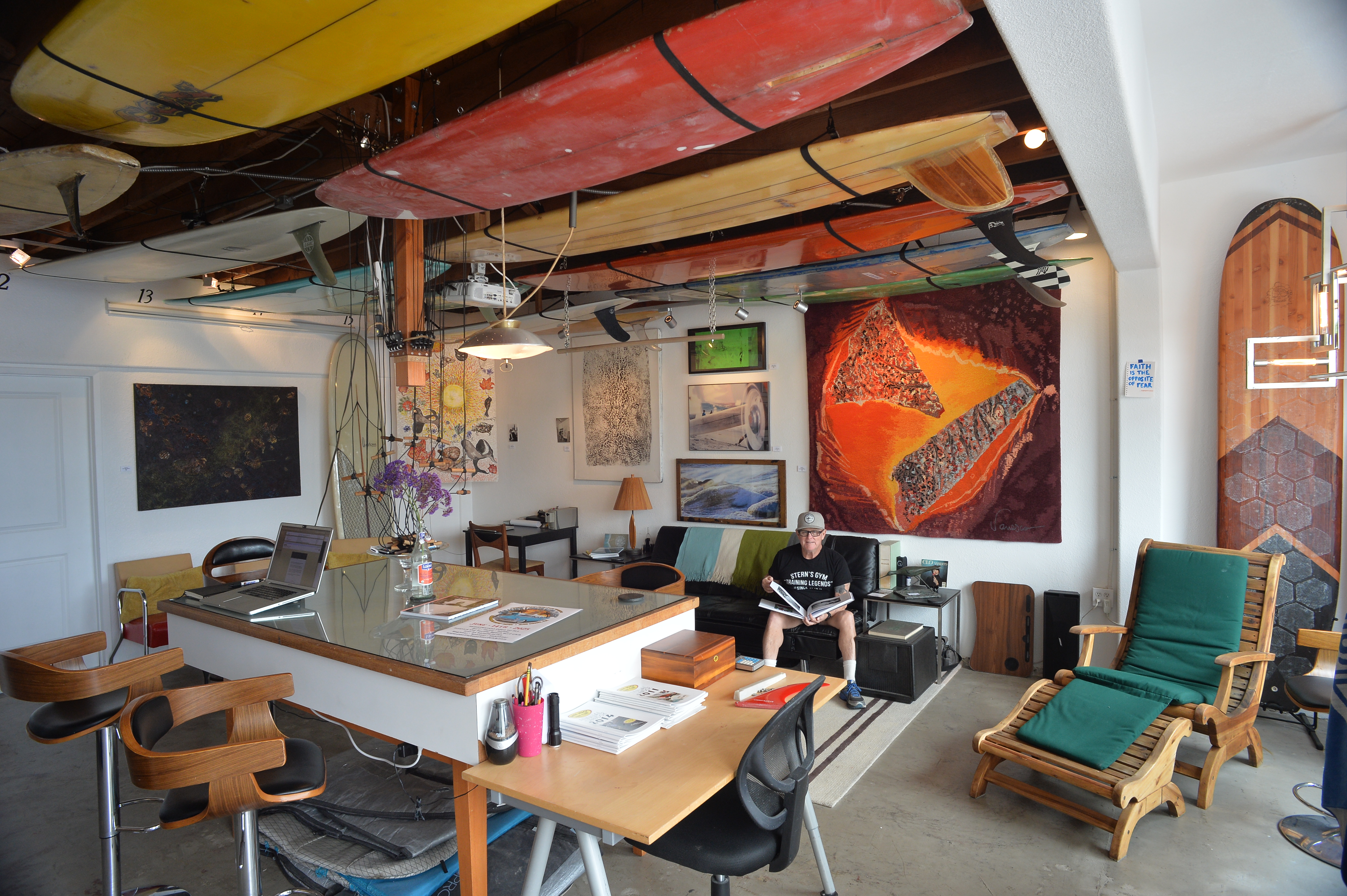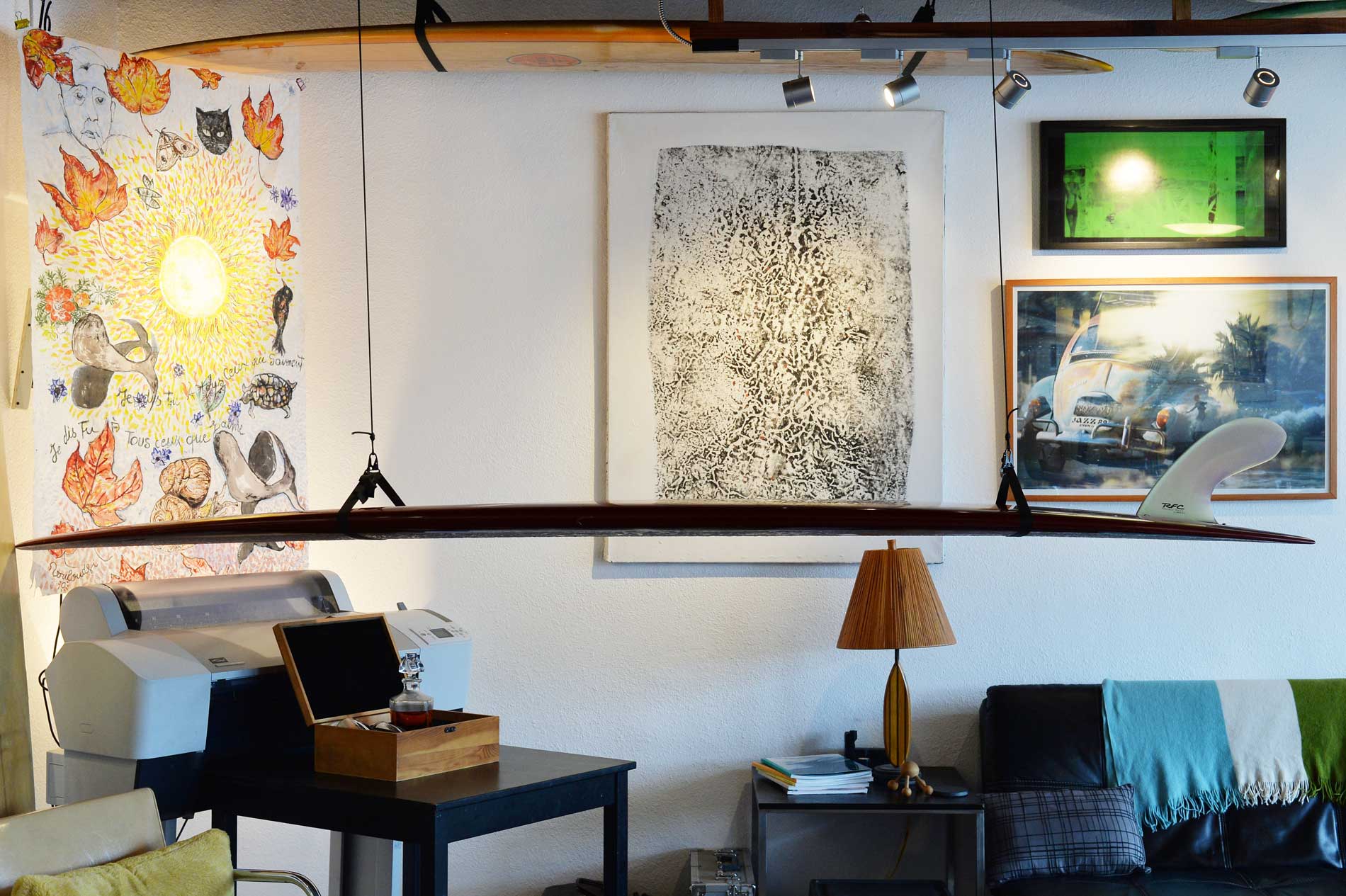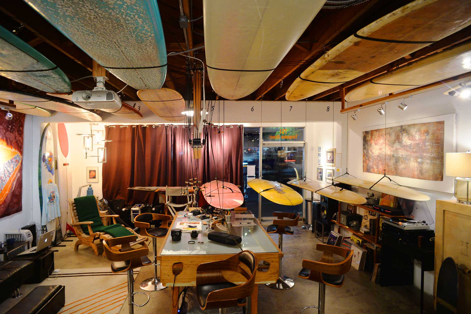 A joint effort of the Kramer Foundation for the Arts, the Gusto Society, and the Pacific Beach Surf Club, the space at 751 Turquoise Street in north Pacific Beach has become a favorite spot for its members to hang in a relaxing atmosphere built almost entirely on analog technologies and featuring a diverse collection of artworks, old and new surf gear, and good vibes.